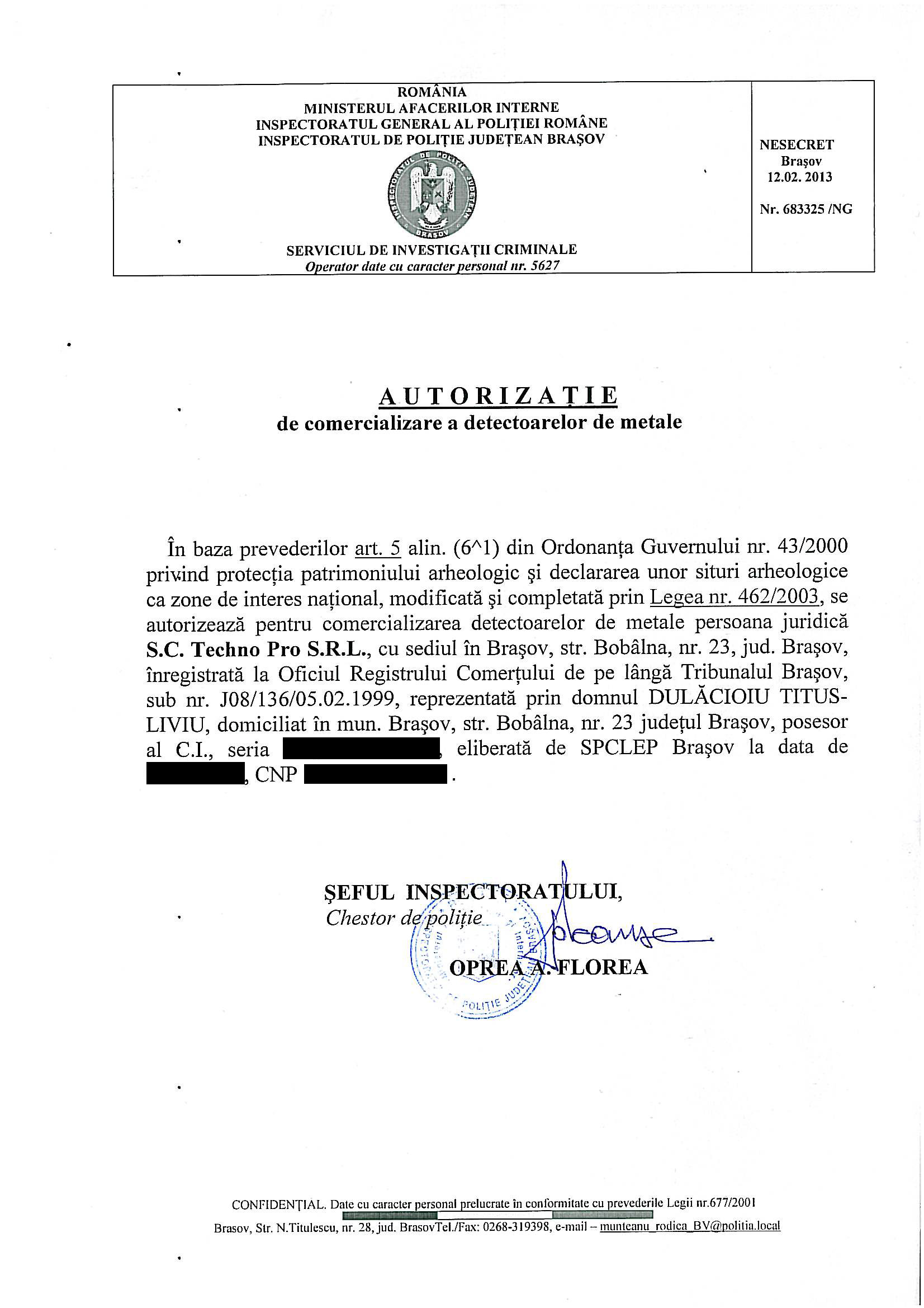 Comercializarea detectoarelor de metale se face conform autorizatiei Nr. 683325/NG din data de 12.02.2013 eliberata de Inspectoratul General al Politiei Romane - Serviciul de Investigatii Criminale conform art.5 alin.(6^1) din OG 43/2000. .